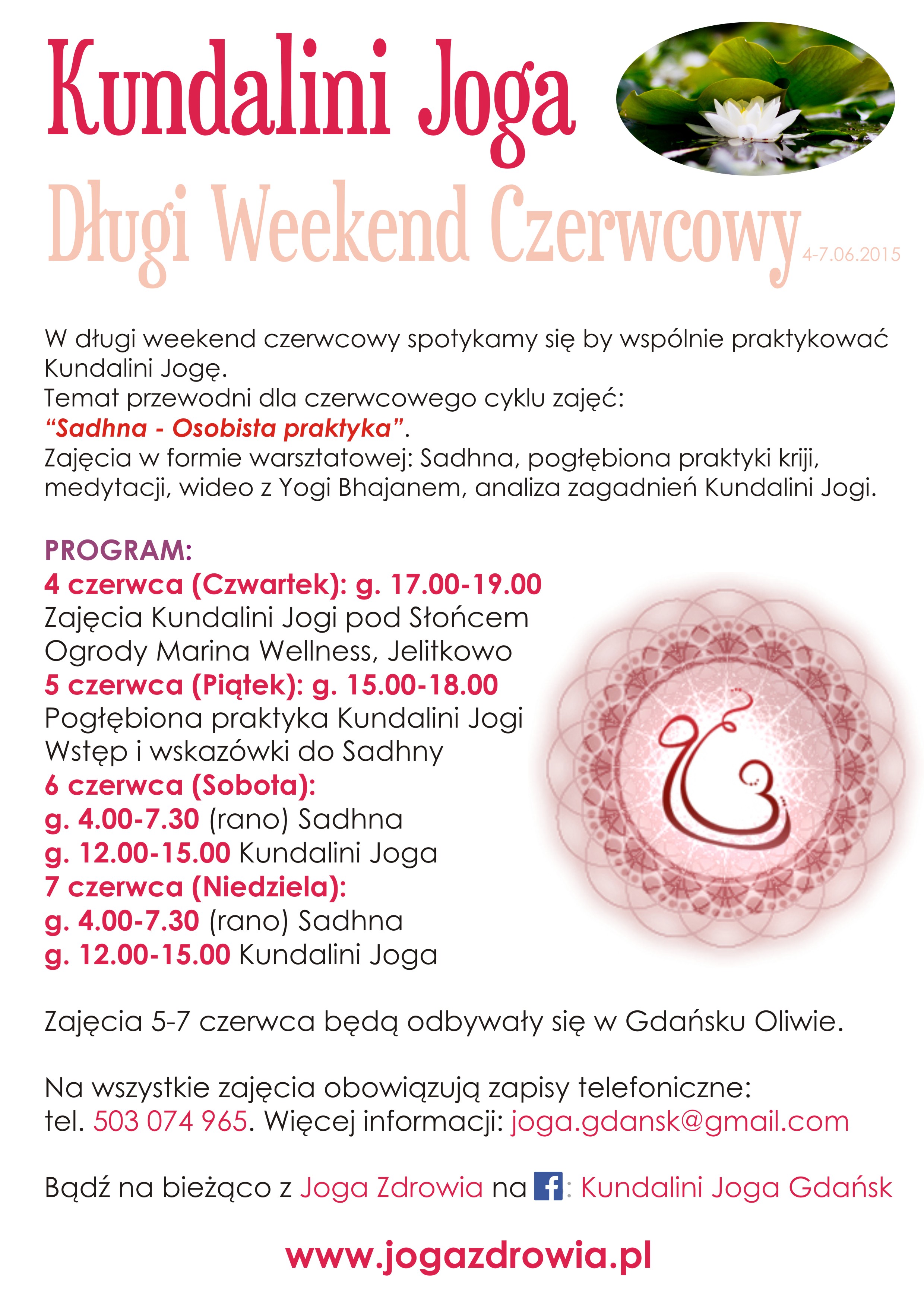 4-7 czerwca: Zajęcia Warsztatowe Kundalini Jogi Zapraszamy do wspólnej praktyki Kundalini Jogi w dniach 4-7 czerwca. Uncategorized 2 czerwca 2015jogazdrowiaOdnośnik bezpośredni